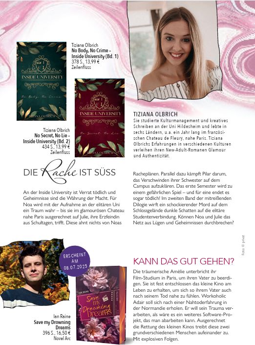 „Aktuell schreibe ich gerade an einem Krimi, wobei auch hier die Liebesgeschichte nicht zu kurz kommt. Eine Prise Liebe gehört für mich einfach dazu“, erzählt Olbrich und erklärt weiter: „Das Setting ist inspiriert von einem alten französischen Schloss, in dem ich für ein Jahr gelebt habe. Glamourös, spannend und natürlich romantisch!“