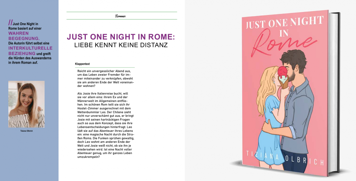 „What’s your story?“ – Mit diesen Worten beginnen für Josie unerwartete und vor allem unvergessliche 24 Stunden mit Leland, ihrem chilenischen Hostelbettnachbarn, in den romantischen Straßen von Rom. In Tiziana Olbrichs Liebesroman „Just One Night In Rome. Liebe kennt keine Distanz“, der im Juli 2023 erschienen ist, geht es um die Liebe, das Leben und darum, wie man aus dem komplizierten und angsteinflößenden Prozess des Erwachsenwerdens endlich ein Abenteuer machen kann. Ein Buch, in dem es nicht darum geht, was nächste Woche oder in drei Monaten ist – es geht ums Jetzt. Ein echtes Wohlfühlbuch für romantische Reiseliebhaber*innen.